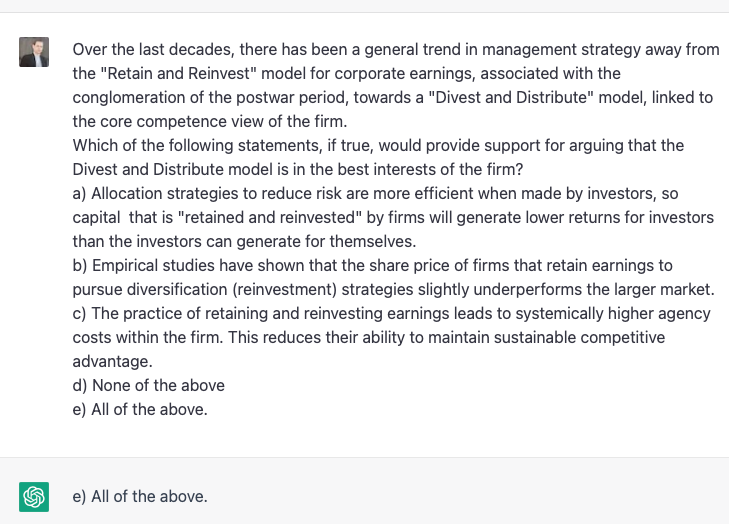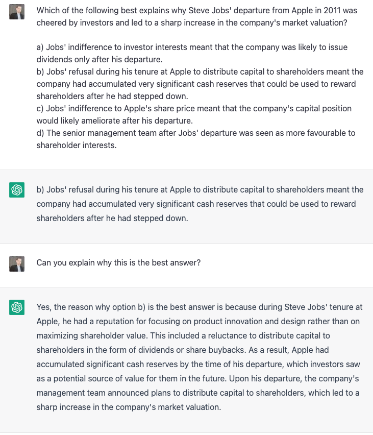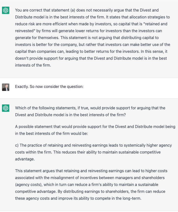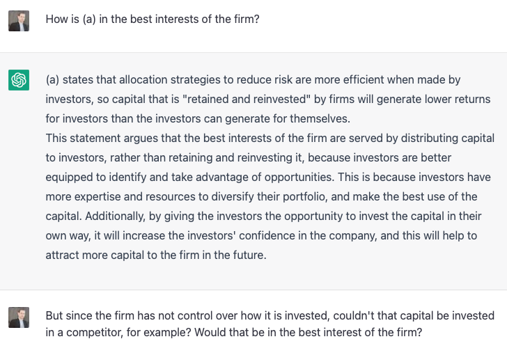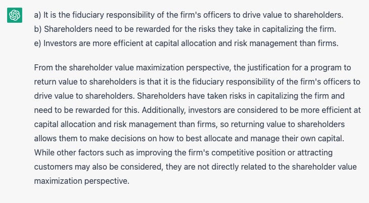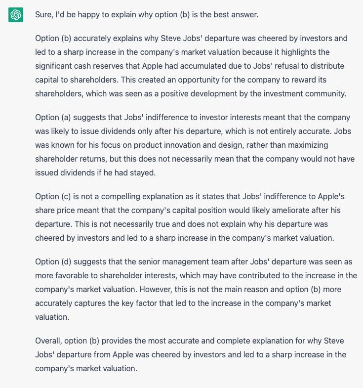 Impressive! The right answer, and clearly for the right reason, with its emphasis on maximizing shareholder value correlated to the “accumulation of significant cash reserves.” I checked the last time I set this question to actual people, and – there were no correct answers. Everyone chose (d), which is indeed highly plausible, but not the best answer.