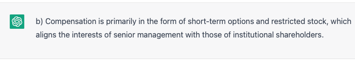 All of these answers are, again, generally correct, except for the causation (not to mention grammatical mistake) in (d), which is highly disputable (although some would maintain this is true). The best answer, though, is (b) since it clearly links to the alignment of executive and shareholder interests (via the issuance of options and restricted shares).