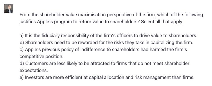 The background to this question is the fact that after Steve Jobs left Apple (shortly before his untimely death from Pancreatic cancer), the share price of the company rapidly increased, despite widespread acknowledgment that he was integral to Apple’s success. So prima facie the market reaction made no sense. Wouldn’t the share price decline after losing its visionary-in-chief? Well, not in a world of shareholder primacy. Jobs had notoriously refused to distribute any of Apple’s enormous mountain of cash to the shareholders and was indifferent to driving up the share price. His moral authority over the company he’d founded meant it was difficult to overcome this obstinacy. So with Jobs out of the way, investors (rightly) concluded that the company would become more responsive to shareholder interests. This was discussed in class. Now, here are the possible answers: