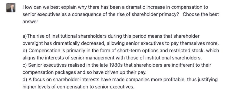 Here’s another one. In my class, I stressed the role that stock options have played in grossly inflating executive compensation and distorting firm strategies to produce more favourable outcomes to short-term shareholder interests, which explains the choices for this question: